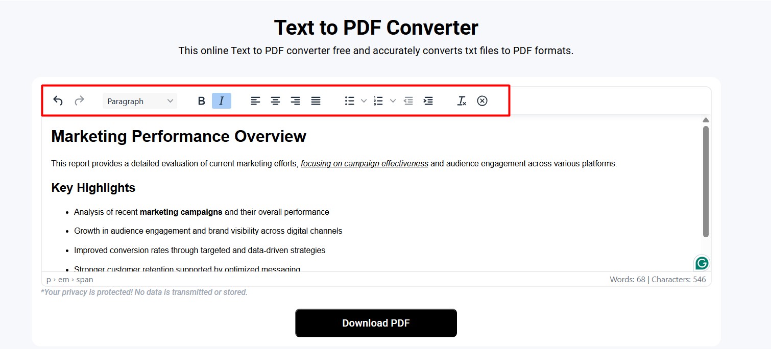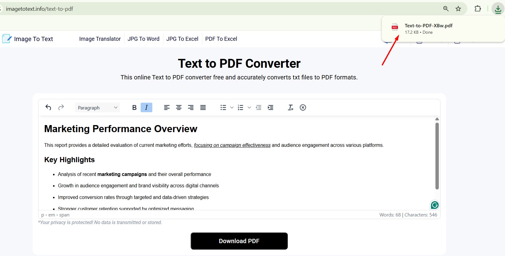 When you’ve done everything, it is time to start conversion. For this, you simply need to click the “Download PDF” button (which is shown in the above image). The tool will instantly turn plain text into a PDF file and automatically download it to your device as well.